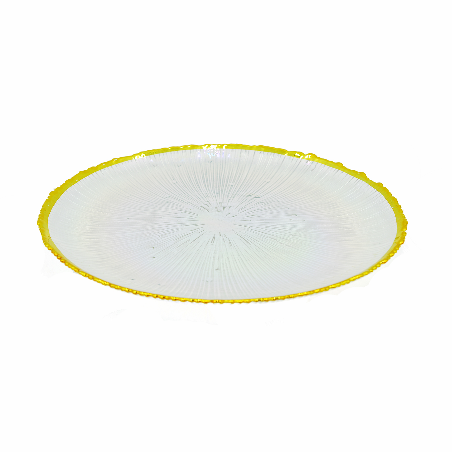 A stunning 33cm glass platter featuring a radiant, sunburst design and shimmering gold edges.